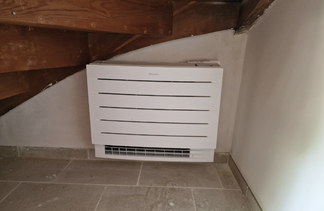 Pour l’étage, notre équipe a installé dans les combles un gainable 7,1 kW DAIKIN avec un pack AIRZONE afin de traiter l’ensemble des chambres.