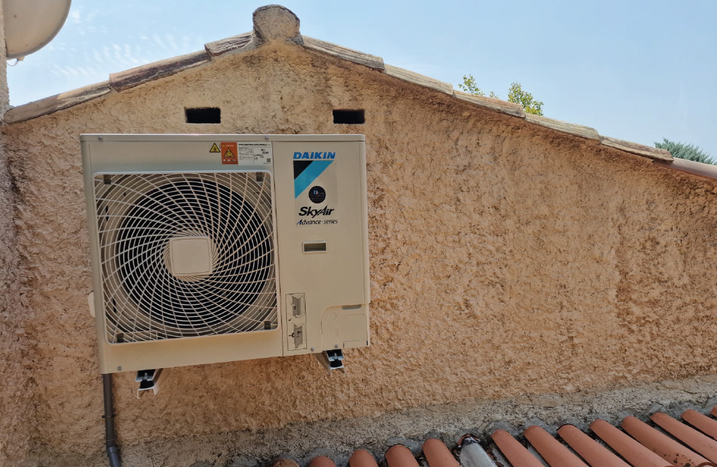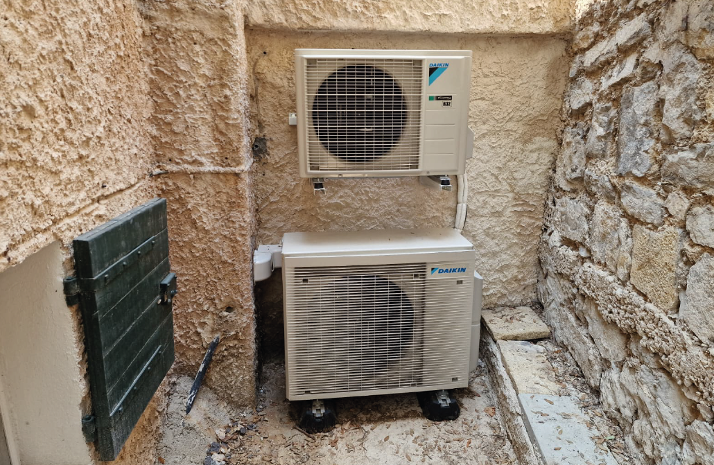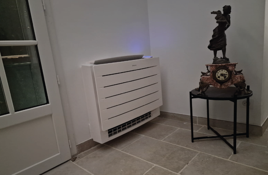 Notre équipe a procédé à l’installation de 3 monoconsoles DAIKIN (2,5 à 3,5 kW) pour traiter l’ensemble du rez-de-chaussée (entrée, salon et salle à manger). Les unités extérieures ont été positionnées sur support-sol contre la façade extérieure.